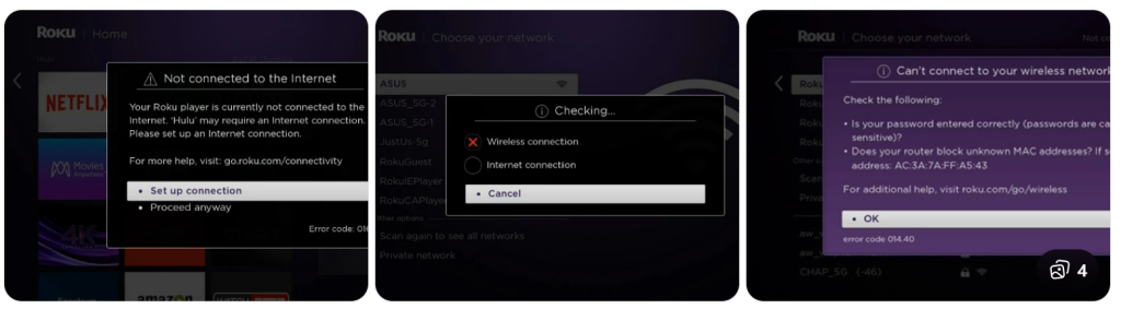 When this error appears, streaming apps like Netflix, Hulu, or YouTube may stop working and the Roku device will show a message such as “Unable to connect to the Internet”.