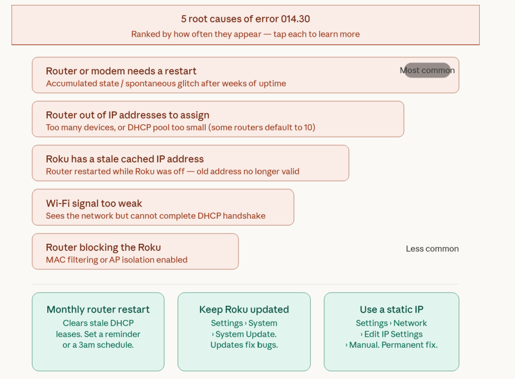 Error code 014.30 is Roku’s way of telling you that the device tried to connect to your wireless network, got a response, but could not complete a working connection to the internet. It is specifically a DHCP failure or IP address assignment problem, which sounds technical but just means your Roku connected to your router but your router did not hand it a working address to use on the internet.